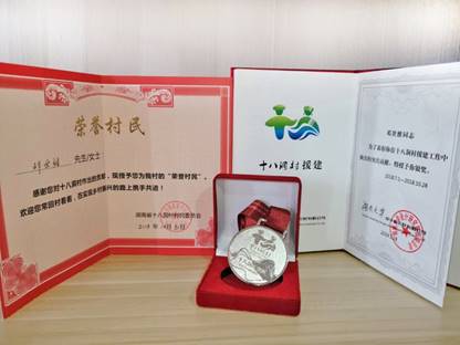 beat365手机版官网入口智博艺创设计研究中心参与了湖南省湘西花垣县十八洞村精准扶贫工作,在战略合作单位湖南大学设计研究院的支持和协作下,公司beat365手机版官网入口邓世维老师带领智博艺创设计团队(易莲、王佳琪、刘玥、张明阳、鲜亚蓉、厉程、蒋鑫成、姚程程)参与了该项目的景观文创设计工作,设计成果获得了一致好评,中共湖南省委办公厅对扶贫工作给予了肯定与鼓励。邓世维老师获得湖南省十八洞村村民委员会颁发的“荣誉村民”称号,并获得设计银奖。