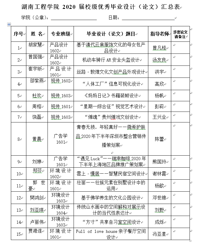 根据《beat365手机版官网入口2020届校级优秀毕业设计(论文)评选办法》,各教研室推送2020届校级优秀毕业设计(论文)共计15篇,经院内教学委员会评审通过,推选邵紫燕同学的《“人体工厂”信息可视化设计》等15篇毕业设计(论文)参评2020届校级优秀毕业设计(论文),现予以公示,公示期为5个工作日。