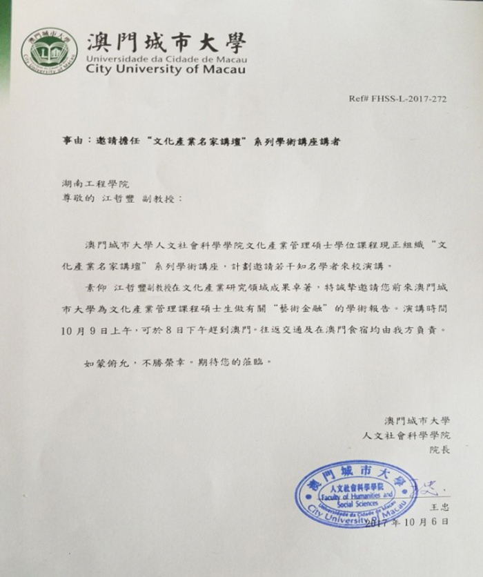 10月9日,公司beat365手机版官网入口江哲丰老师受澳门城市大学邀请,前往该校为人文社会科学公司文化产业专业研究生举办学术讲座。