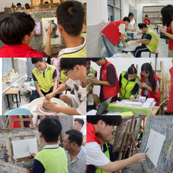 “这边阴影可以再重一点。”“线条排列可以再密集一点。”“等陶泥干后我们再均匀喷上釉,就可以变得光滑。”……志愿者对孩子们进行一对一引导,帮助他们起形、削笔、切割陶泥、换水,忙碌不停。我院邝卫国老师、教工党员彭莉和志愿者们一起给孩子们带来了生动有趣的美育课,引导孩子们多角度体验艺术创作的魅力,训练手眼协调和线条感知能力,为他们打开了一扇艺术之窗。
