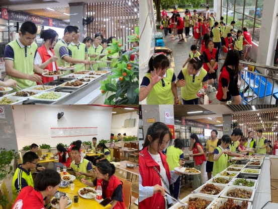 晚餐时间,志愿者们带着孩子们在明德二食堂教工餐厅排队就餐。丰富又营养的菜品、喜欢的饮料,贴心准备好的水果,让孩子们倍感爱与温暖。孩子们通过手语与志愿者交流,有的用右手在左臂上比划几下,有的用手比划着数字,有的指着各种食物,志愿者都逐一回应,和孩子们积极互动。