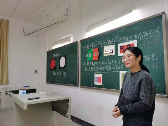 在教学展示中,鹿滢以“色彩视错觉”为主题,从色相、饱和度、明度三个方面详细讲解色彩视错觉的运用;吴萍以字体的不同写法和形态为导入,案例式讲解了创意字体设计的方法;唐颖新老师以角色分析为视角对广告设计的流程进行讲解。高卫国、程玉兰两位专家分别对三位老师的教学内容、教学方法、板书设计进行了全方位的点评和指导。