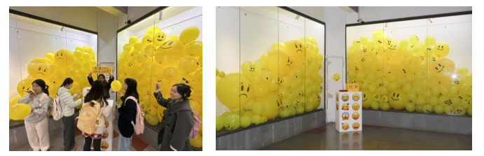 设计艺术楼二楼大堂的 “表情包气球” 作品凭借独特创意脱颖而出。作品通过直观呈现 “积极” 与 “消极” 两种情绪,为师生搭建了一个情绪表达与释放的专属出口,让抽象的情感在公共空间中变得可感可触。