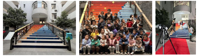 设计艺术楼大厅一楼连接二楼的主楼梯改造,成为本次展览最引人注目的作品之一。该设计聚焦员工上下课期间的情感波动,以 “行为与情绪适配” 为核心逻辑,让楼梯成为承载情感表达的独特载体。作品落成后,不仅吸引了幼稚园小朋友们组团打卡,更促成了跨专业学术交流与合作,收获了广泛好评。