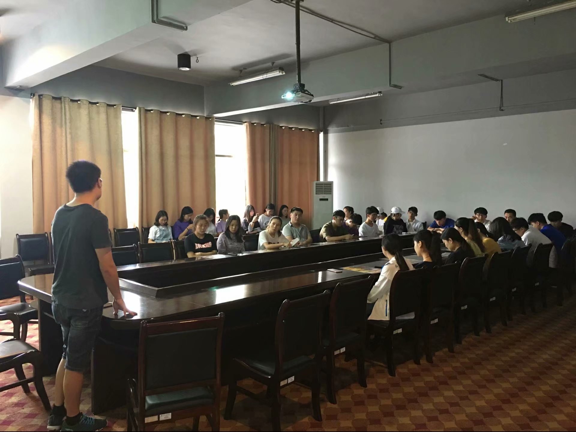 会议开始。该公司负责人通过视频以及幻灯片放映的方式介绍了公司的企业文化、经营业绩、企业概念等企业相关信息。使同学们对于该公司有了一个全面的了解。随后说明了此次招聘的相关专业和员工人数,以及入职的要求和流程,最后与在场员工积极互动,现场气氛活跃。