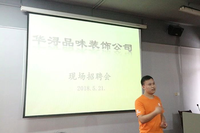 会上负责人肖凯先生首先简单的介绍华浔品味集团的基本情况。之后通过播放宣传片、PPT展示、面对面交流等方式向同学们介绍公司的构成、未来发展方向、人员需求以及选择该单位的理由等;随后,同学们也分别向公司负责人提出了一些与将来工作相关的实际问题,并得到了满意的回答;最后,公司负责人对有意签约的同学进行了一对一面试并达成了初步签约意向。