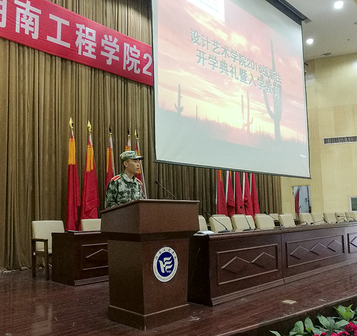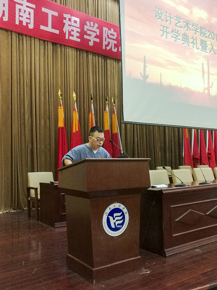 伴随嘹亮的国歌声,16级新生开学典礼拉开帷幕。经理段辉首先致辞,主要给新生介绍了应该以怎么样的一份责任和态度来对待老员工活,要珍惜自己的选择,珍惜四年时光,好好学习。接下来,现代设计研究所副主任冯亚星老师作为教师代表发言,根据艺术与设计专业诠释“工匠精神”,希望大家将品味与思考握在手心融在心里,通过四年的知识积累滋养技艺,提升心灵。在四年之后成为具有哲匠精神的新一代艺术设计大师。