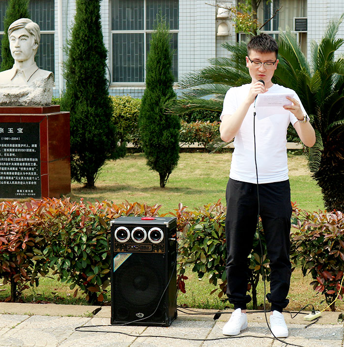 辅导员张超在此次活动进行了简短且深刻的讲话,简短的介绍了宗玉宝同志的身平,高度赞美了他的英勇事迹,同时他还号召全院员工向宗玉宝同志学习,学习他的这种精神,为建设校园,尽一份力,为社会这个大家庭尽一份力!