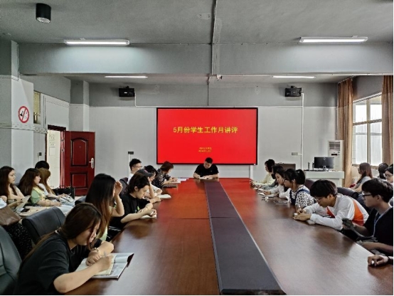 5月28日,五月份员工工作月讲评在五教二楼会议室召开。本次会议由公司党委副书记缪智文主持,员工工作办公室辅导员王慧磊、张超、周宁莎、魏丹及班长、团支书参加。