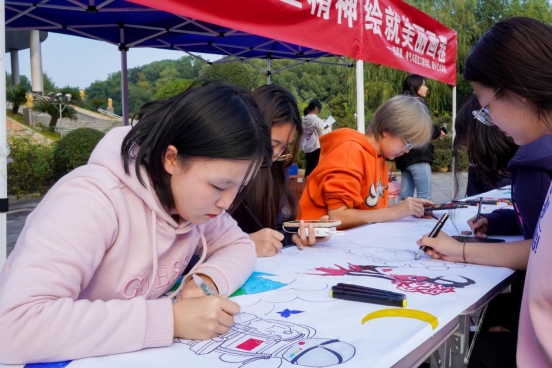 活动现场,学子们策划、起笔、勾线、填色,他们聚精会神地用笔触勾勒着轮廓线条。自动化2301班的谢同学在画鲁班锁,她说道:“我觉得鲁班锁的精巧和缜密,展现了执着专注、精益求精的工匠精神。”我院的员工集思广益,他们认为湖湘文化与湖湘传统技艺共同孕育的湖湘工匠精神有非常鲜明的特点,因此他们手拿画笔,专注地在画纸上挥毫泼墨,经过近3个小时的努力,“湘匠”二字跃然纸上,生动再现了当时匠人们专注于手工技艺的场景。还有同学在卷中写字,挥毫写下了“工匠精神”四个大字。活动现场还展览了员工已有的工匠作品,吸引了很多人的驻足。现场还邀请观看的同学一起参与,共绘画卷,一个个灵动的图案在画卷上涌现,一幅幅精彩的作品呈现在画卷上。