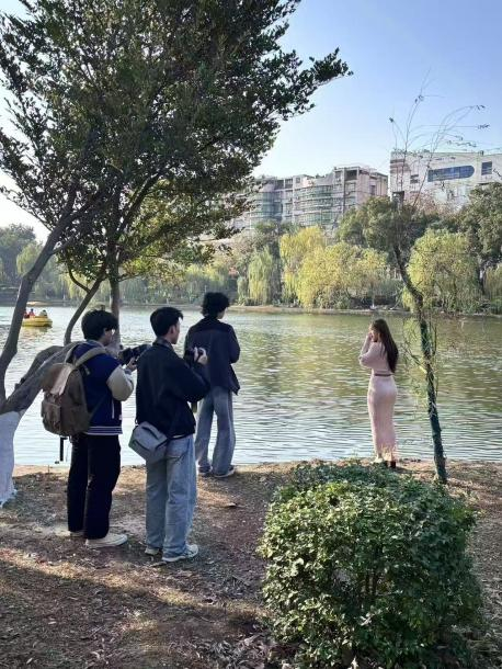 自由创作环节中,社员们充分发挥创意各展所长:有的聚焦微观景致,用微距镜头捕捉花叶上的露珠与残冬未落的楝果;有的立足全景视角,以木鱼山绿林为背景,记录湖山相映的立体画卷;还有的以人文为切入点,用镜头定格市民休闲漫步的烟火气息。大家在行走中观察、在拍摄中思考,将课堂所学的广告摄影理论与户外实践深度结合,不仅提升了光影捕捉能力和画面叙事能力,更在亲近自然的过程中释放了创作灵感。